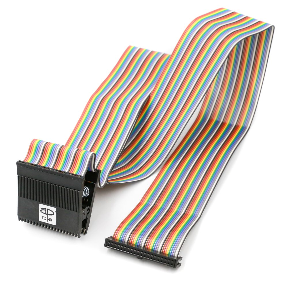 40 way multi-coloured flat cable with headers for connection to 40 pin DIL Test Clips and a 64way Socket Connector for connection to test equipment - mates with two rows of 0,635mm (0,025") square or diameter pins on 2,54 mm (0,100") centres.